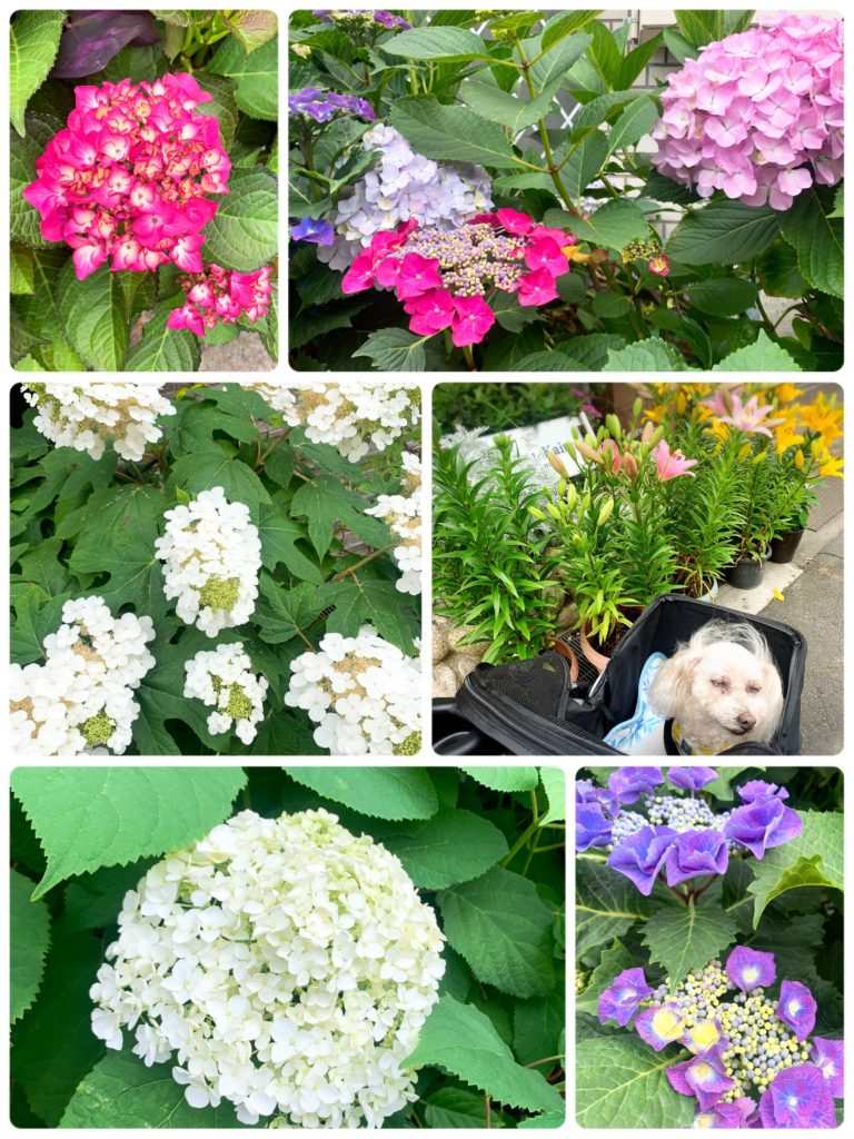 シッターお馴染みの「みーちゃん」とお散歩中、地面が暑い時間帯はキャリーに乗ってもらってのお散歩です。歩いていると、色んなお花が目につき楽しんでいます。今は、春のお花が終わり、梅雨から夏にかけてのお花が元気に咲いています。その中でも一番目につくお花は「アジサイ」つい先程も、30分ほどのお散歩でしたが、沢山の種類のアジサイに出会いました♪ 一体何種類あるのでしょう。。。とてもきれいで吸い込まれそう。あ、吸い込まれるで思い出しましたが、バラも沢山咲いてますね。バラの花を見ると匂いを嗅ぎたくなるのです。バラによって匂いが異なるんです。お花っていいなぁ♡